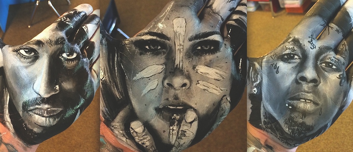 Artist Russell Powell creates Portraits of 2Pac, Lil Wayne, Marley and Lennon on his Hand and stamps them on Paper