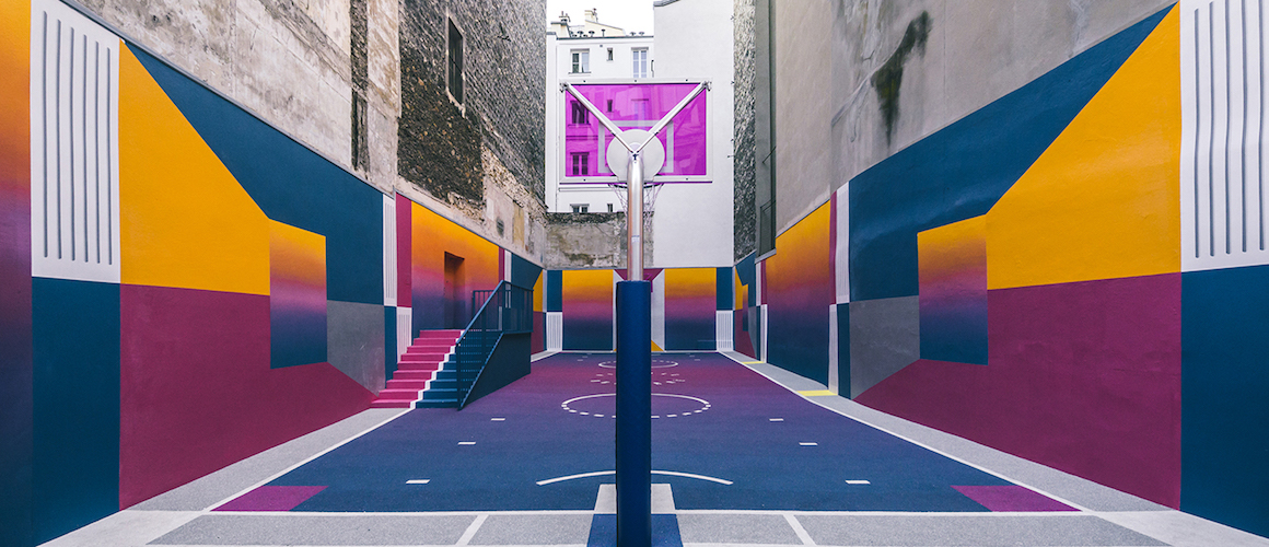 Vibrant Basketball Court Sandwiched Between Apartment Buildings by Pigalle x Ill-Studio in Paris