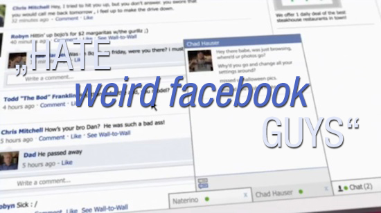 Das hier werden alle whudat-Leserinnen mit facebook-Account kennen: ständig wird man zugespamt, gestalked und sexuell belästigt – es ist eine Farce! Wie sowas aussehen kann, haben die Damen und Herren von College Humor sehr schön in einer Eminem/Rihanna („Love The Way You Lie“)-Parodie verbildlicht – fantastisch: