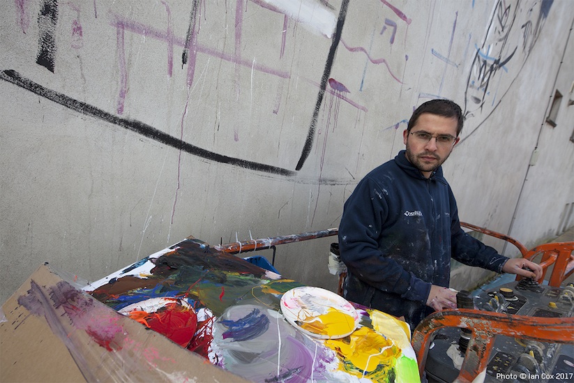 Sebas Velasco is also part of this year’s brilliant lineup for the second edition of The Crystal Ship Street Art Festival currently taking place on the streets of Ostend in Belgium. Blending his expressive painterly style with the building, the talented artist is in the process of creating another impressive piece which will be enjoyed by the local residents for years to come. The Spanish artist has been painting graffiti since 2004, but his artistic language was influenced by his degree in Fine Arts at the University of País Vasco and Masters Degree in Painting at UPV/EHU.