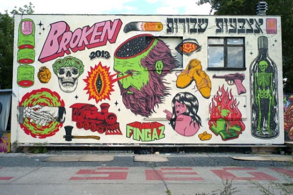 Die Broken Fingaz Crew, bestehend aus Deso, Kip, Tant and Unga, bleibt schwer aktiv. Nach Amsterdam ist die israelische Crew nun von Urban Spree nach Berlin eingeladen worden und dabei ist dieses, wieder sehr detaillierte und farbprächtige Mural herausgekommen. Wer also schon immer mal Adolf Hitler in pink mit schwarzem, wallenden Haar begutachten wollte, der hat jetzt in der Nähe… Weiterlesen