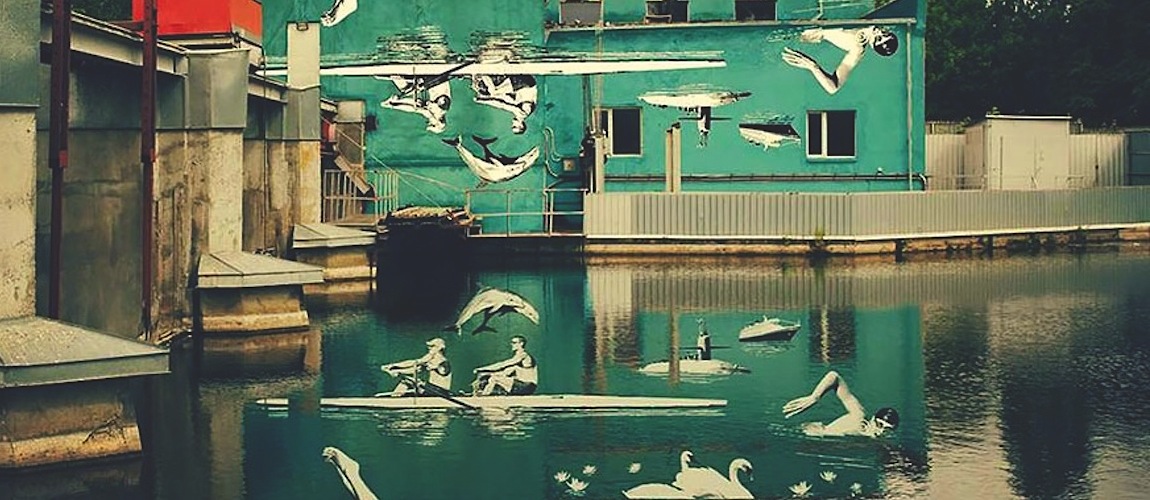 Upside-Down Mural That Reflects Right-Side-Up Onto Water in Marijampole/Lithuania by Artist Ray Bartkus