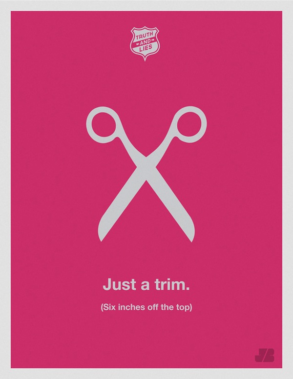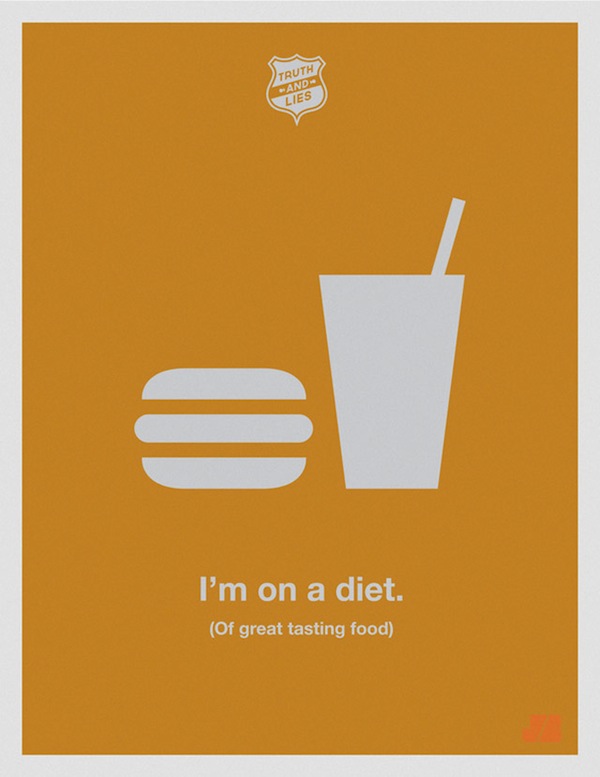 Sehr schöne, minimalistische Poster-Serien von Justin Barber namens „Truth and Lies“. Die kleinen Notlügen, die wir alle kennen (aber selbstverständlich niemals selbst nutzen!). Poster #4 funktioniert auch mit Zigaretten, wie man so hört.